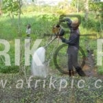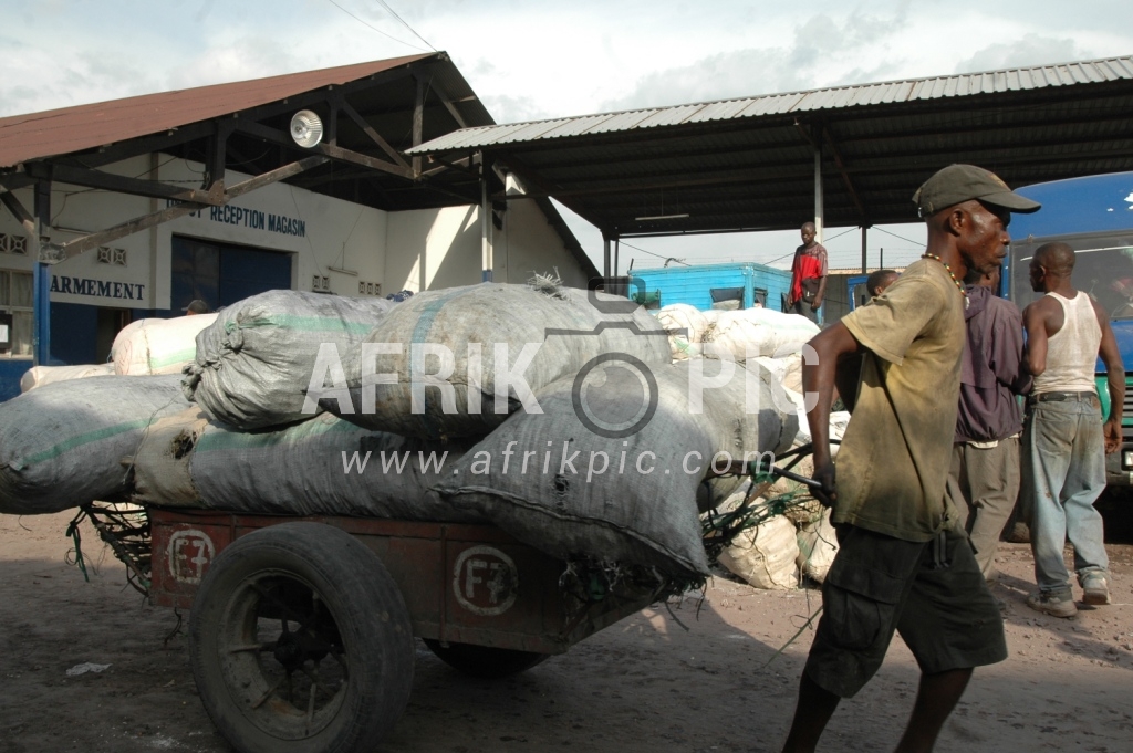 Un homme tire une charrette chargée de marchandises non loin de marché de Kinshasa.