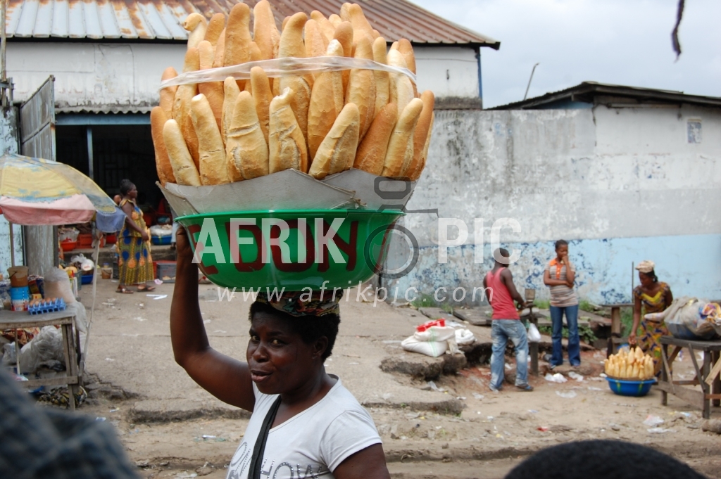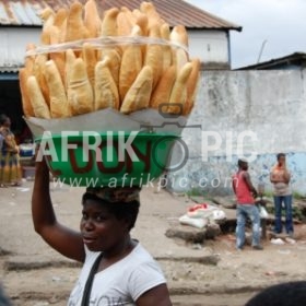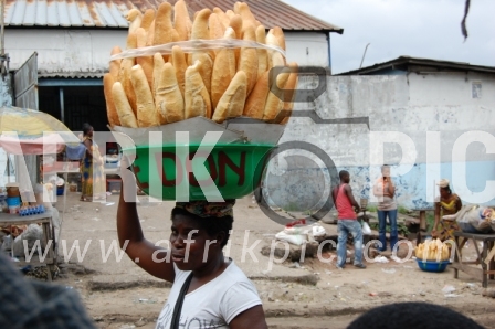 Une femme parcourant les rues de Kinshasa avec un bassin de pains sur la tête.